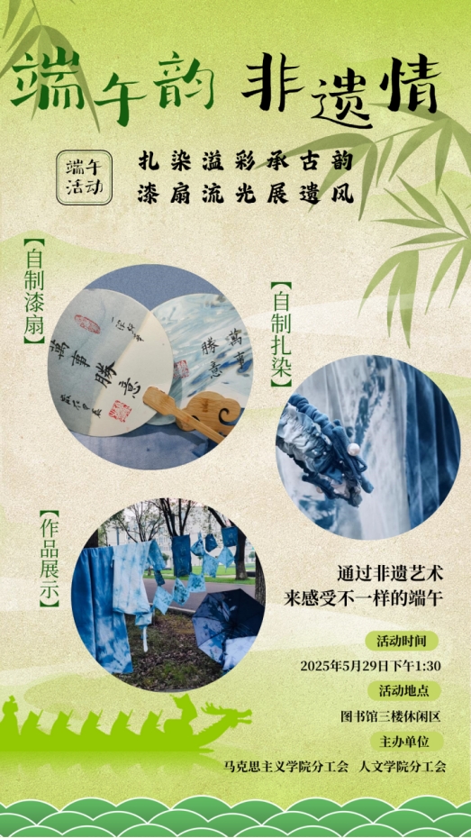 端午临仲夏,非遗绽华光。为传承中华优秀传统文化,让老师们深入体验端午习俗与非遗魅力,增进教职工之间的沟通交流,丰富教职工精神文化生活,SUNBET申搏官网分工会与人文学院分工会联合开展“端午韵・非遗情——扎染溢彩承古韵,漆扇流光展遗风”庆端午主题活动,现将相关事宜通知如下。