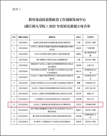 近日,教育部高校思想政治工作创新发展中心(浙江树人学院)公布了2025年度教育部高校思想政治工作创新发展中心(浙江树人学院)研究课题立项和预立项名单,由申搏官网思政课教师王灵芝教授主持的《生成式人工智能意识形态舆情风险及应对策略研究》课题获研究课题立项。