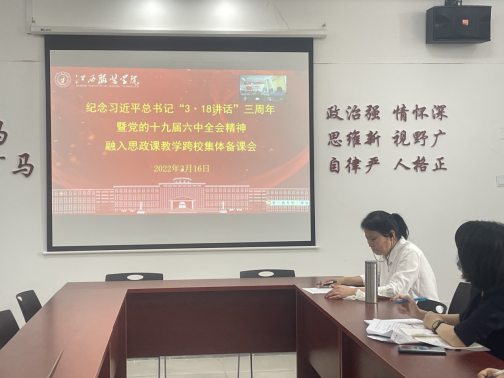 为深入贯彻落实习近平总书记“3·18”重要讲话精神,将党的十九届六中全会精神融入思政课教学,进一步探讨思政课问题式专题化团队教学改革,在“3·18”重要讲话精神指导下提升思政课教学质量。3月16日下午,SUNBET申搏官网SUNBET申搏官网教师通过线上参加了由南昌工程学院主办的纪念习近平总书记“3·18”讲话三周年暨党的十九届六中全会精神融入思政课教学片区跨校集体备课会。
