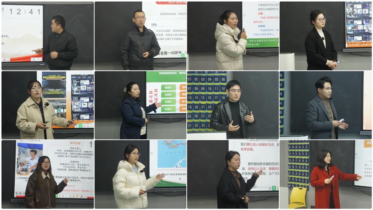 比赛环节,23位青年教师按照抽签顺序依次登台,围绕马克思主义中国化最新成果、新时代社会发展热点等主题展开授课。有的教师以时政新闻为切入点,用鲜活案例诠释理论内涵;有的教师以互动提问为抓手,用启发引导激发思考热情;有的教师以板书设计为亮点,用逻辑框架梳理知识体系,充分展现了青年思政课教师扎实的理论功底与多样的教学风格。