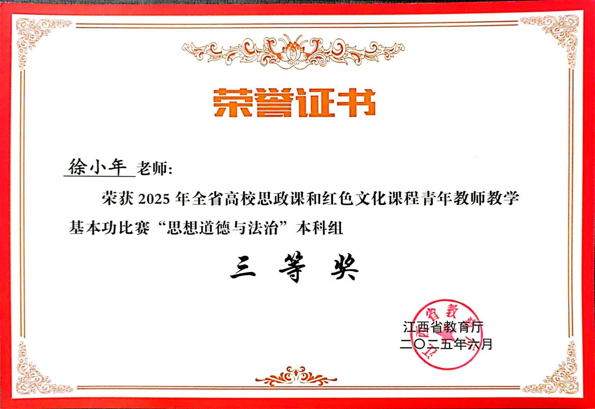 SUNBET申搏官网 讯近日,江西省教育厅正式公布2025年全省高校思政课和红色文化课程青年教师教学基本功比赛结果,在这场汇聚全省高校教学精英的激烈角逐中,申搏官网思政课教师徐小年凭借扎实的专业素养与创新的教学风采斩获《思想道德与法治》课程(本科组)三等奖。