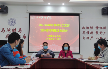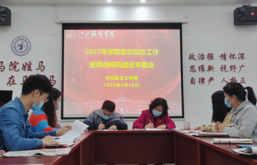2022年3月15日下午,SUNBET申搏官网在学院活动室组织召开2022年意识形态工作暨师德师风建设专题会议,会议由学院党总支副书记陈洋安主持,学院院长周丽琴、副院长贺松兰、张龙龙及学院全体教师参加会议。