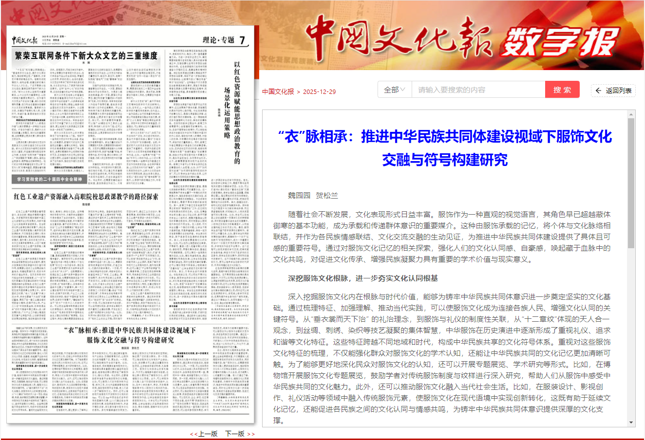 《中国文化报》(2025年12月29日 第7版 理论专题)刊登SUNBET申搏官网SUNBET申搏官网教师魏园园、贺松兰署名的文章《“衣”脉相承:推进中华民族共同体建设视域下服饰文化交融与符号构建研究》。文章指出,随着社会不断发展,文化表现形式日益丰富。服饰作为一种直观的视觉语言,其角色早已超越蔽体御寒的基本功能,成为承载和传递群体意识的重要媒介。这种由服饰承载的记忆,将个体与文化脉络相联结,并作为各民族情感联结、文化交流交融的生动见证,为推进中华民族共同体建设提供了具体且可感的重要符号。通过对服饰文化记忆的相关探索,强化人们的文化认同感、自豪感,唤起藏于血脉中的文化共鸣,对促进文化传承、增强民族凝聚力具有重要的学术价值与现实意义。