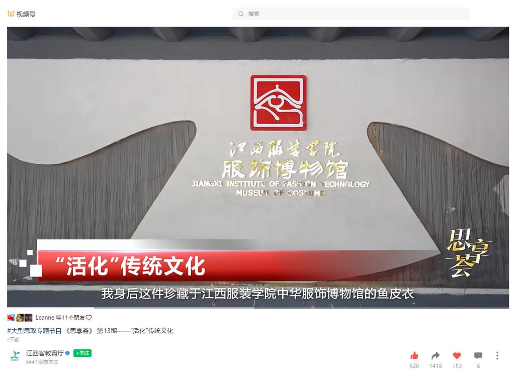 3月15日,江西省教育厅推出大型思政专题节目《思享荟》第13期——“活化”传统文化,报道申搏官网“中华服饰博物馆”在弘扬和传承中华服饰优秀文化上发挥的积极作用,通过传承和弘扬中华优秀传统文化,不断提高公众的文化认同和文化自信,让传统文化在历史发展的长河中绽放绚丽之花,共绘人类文明壮丽画卷。