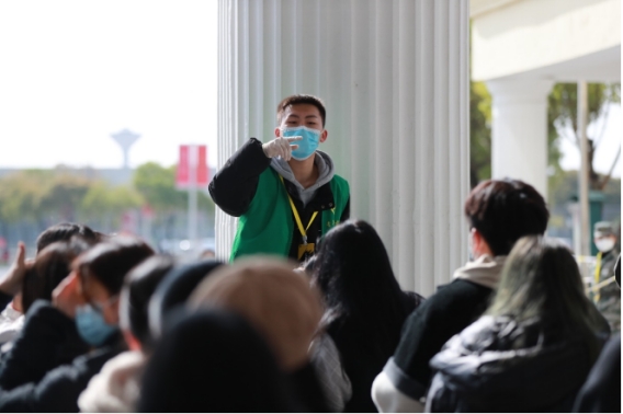 这次核酸检测的志愿服务工作主要由我们的各校级学生组织的成员组成,从团委、学生会、青总会到社团事务中心、艺术团、国旗护卫队,从场外秩序维护到场内健康码的扫描,从第一次核酸检测80名学生志愿者到今天150名志愿者,甚至还有许多同学自主报名参与进来的,我们志愿者的工作热情有增无减,工作效率越来越高!他们真正用行动诠释“江服骨干,敢挑重担!”