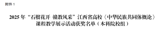 近日,江西省教育厅公布了2025年“石榴花开 赣教风采”江西省高校《中华民族共同体概论》课程教学展示活动的评选结果,经学校遴选推荐、视频展示、现场教学评审等多个环节的激烈角逐,申搏官网思政课教师杨渝博士荣获本科院校组三等奖。
