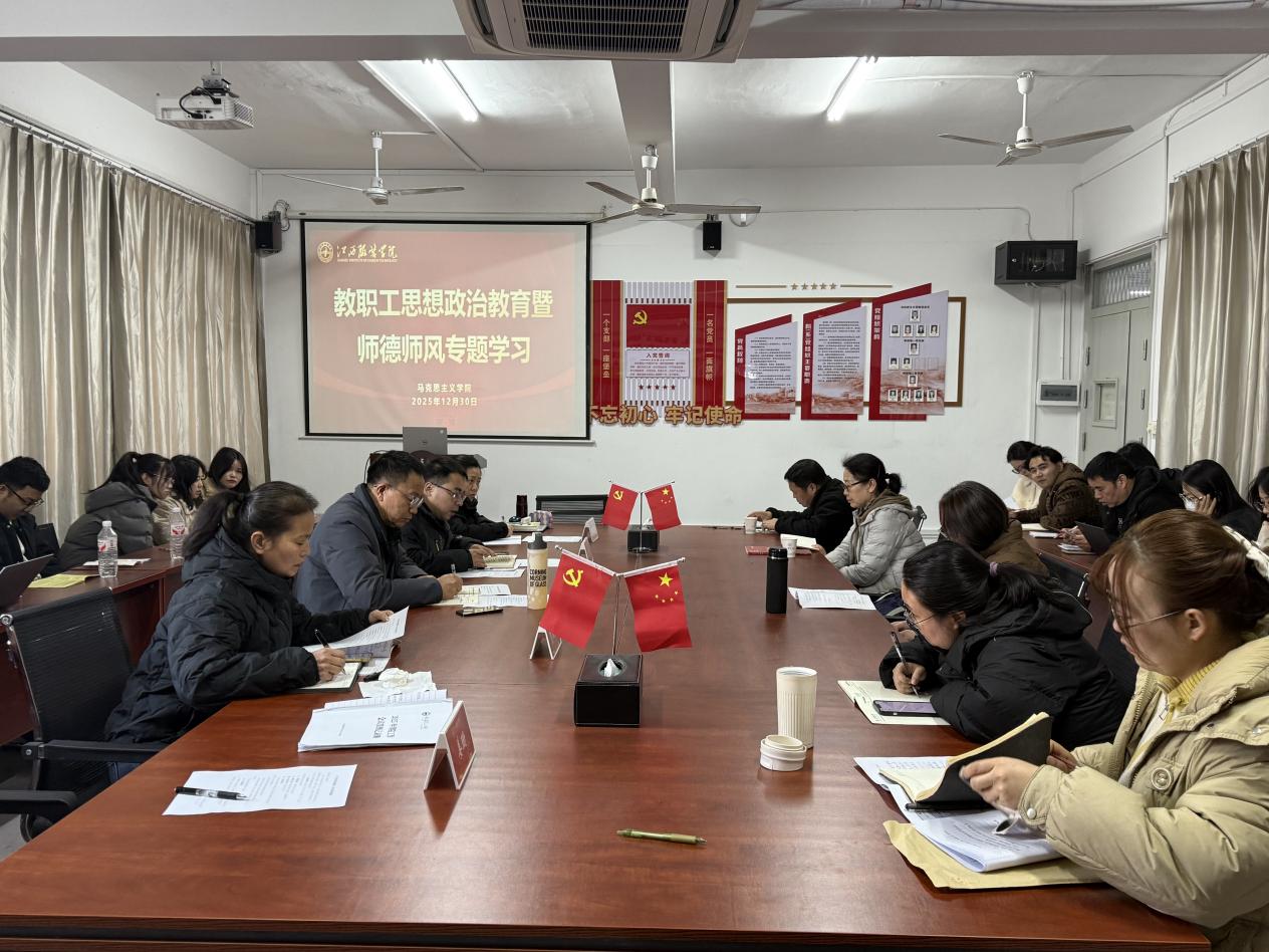 (SUNBET申搏官网 讯)为深入落实立德树人根本任务,引导思政课教师坚守教育初心、践行育人使命、规范从教行为,2025年12月30日下午,SUNBET申搏官网在主教学楼240会议室召开教职工思想政治教育暨师德师风专题学习会。学院党政领导班子成员及全体教职工参会,会议由学院党总支副书记陈洋安主持。 会上,学院院长肖杰带领全体教职工重温《新时代高校教师职业行为十项准则》,逐条款解读核心要求,明确师德师风红线底线;同时通报近期违反师德师风典型案例,以反面典型为镜鉴,以案明纪、以案示警。肖杰强调,思政课教师是立德树人的关键力量,师德师风是立身立教的根本准则,要做到“明大德、守公德、严私德”,既当知识传授者,更做学生思想引路人,以高尚师德涵养优良师风,以严谨师风赋能思政教学。 陈洋安对学院2025年师德师风建设工作进行全面总结。他指出,2025年学院以大力弘扬教育家精神为主线,抓实师德师风建设各项工作:以部署会定方向、以承诺书立誓言、以宣誓仪式强信念、以专题培训提素养、以科学研究赋能促提升;将师德学习教育融入党支部“三会一课”、教研室教研活动,强化课堂阵地管理、网络行为规范,筑牢师德建设防线。全年学院教职工无违反师德行为发生,责任担当意识、育人履职能力显著提升。 会议强调,师德师风建设直接关系思政课教师队伍整体形象,关乎思政教育育人实效,全体教师必须提高政治站位,深刻认识加强师德师风建设的极端重要性。会议对全院教职工提出三点希望:一是持之以恒强理论,筑牢政治根基,把党的创新理论学深悟透,将理论修养转化为育人能力;二是坚守育人初心使命,以学生为中心,因材施教、用心赋能,做学生成长路上的良师益友;三是主动担当作为,彰显师者本色,立足思政课阵地,守正创新、深耕细研,以实际行动诠释为党育人、为国育才的初心使命。 此外,会议还就2025年度师德考核工作作出具体部署,要求严格落实考核要求,以考核促提升,推动师德师风建设再上新台阶。