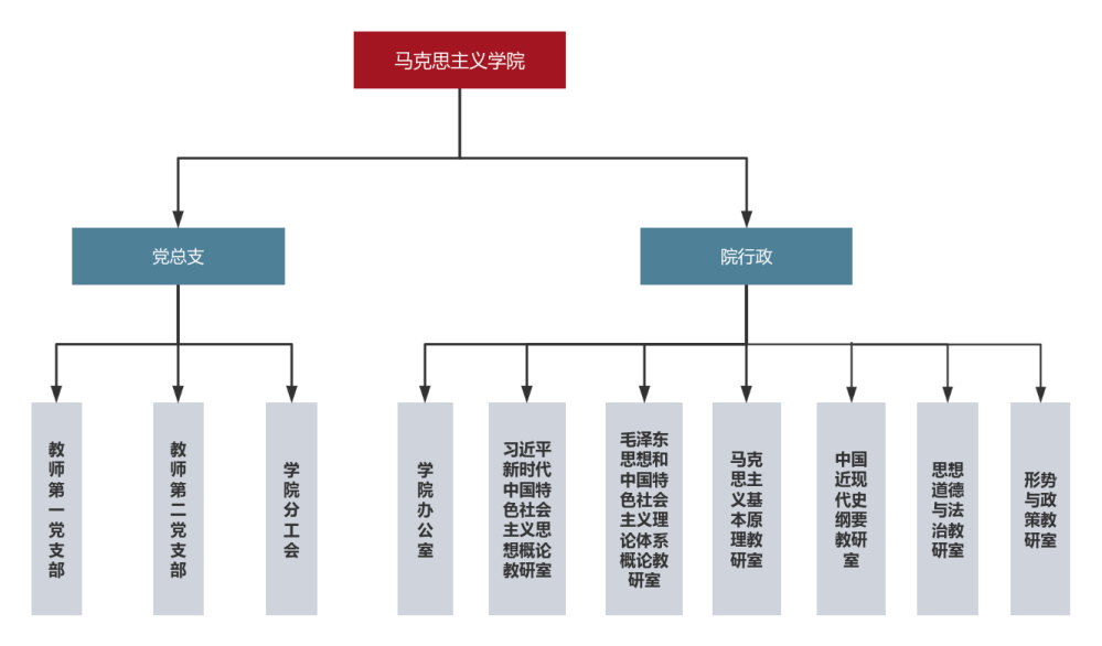 SUNBET申搏官网党总支组织机构分设教师第一党支部和教师第二党支部;学院教学机构是按课程设置六个教研室,即习近平新时代中国特色社会主义思想概论教研室、思想道德与法治教研室,中国近现代史纲要教研室、马克思主义基本原理教研室、毛泽东思想和中国特色社会主义理论体系概论教研室、形势与政策教研室。